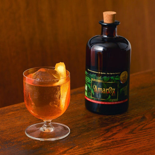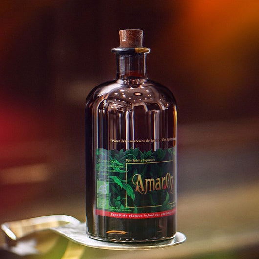 el DJIN Signature Amaroz sin alcohol 0% es un amargo digestivo sin alcohol elaborado a partir de las colas de destilación de Djin Pasión por la Naturaleza N°1 en el que se han infusionado más de treinta plantas medicinales, incluidas la cúrcuma, la naranja amarga y la genciana para obtener aún más sabores: AmarOz se posiciona como una alternativa deliciosa, saludable y muy baja en azúcar (<0,2 g/100 ml) al Aperol o Campari.