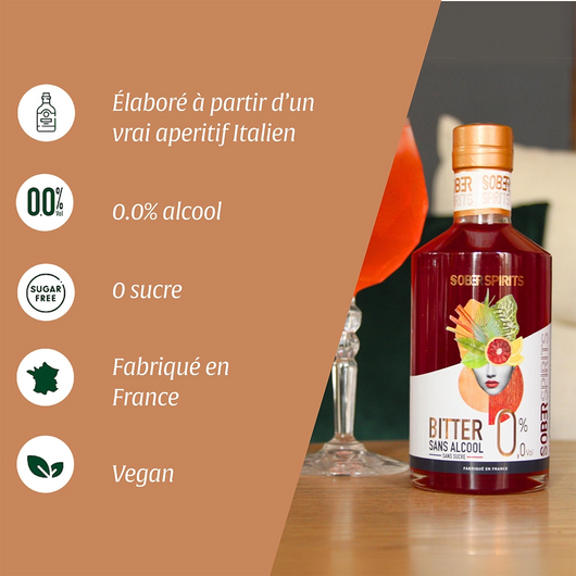 Sober Spirits Bitter 0,0% - Bitter Alternative comienza su andadura en Italia donde se destila por primera vez. Luego se transporta a Grasse, la capital mundial del perfume, donde se extrae cuidadosamente el alcohol, dejando un 0,0% de alcohol amargo. El etanol encontró entonces un nuevo uso en la alta perfumería. Por último, es en el corazón de Francia, en una destilería que data de 1875, donde este 0,0% Amargo se mezcla con diferentes frutas, plantas y raíces, proceso que intensifica su bouquet aromático. Esta técnica de elaboración preserva los ricos aromas, la textura suave, la estructura y la longitud en boca del destilado original, al mismo tiempo que no contiene alcohol ni azúcar.