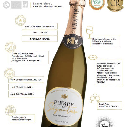 Una alianza de delicadeza, pureza y elegancia, Pierre Zéro Signature Blanc no contiene azúcares añadidos, conservantes, saborizantes ni sulfitos.